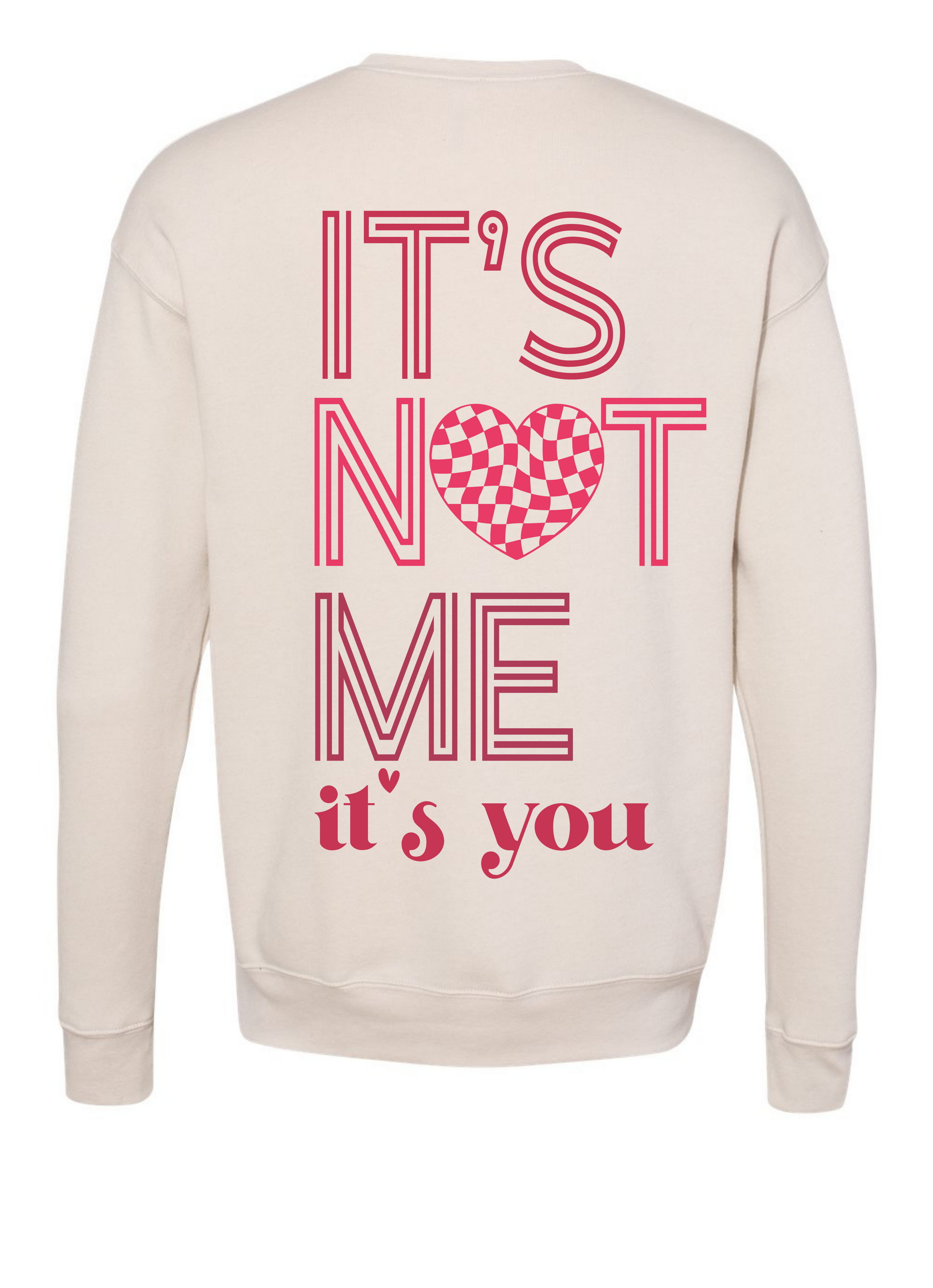 Embrace retro charm with this playful graphic tee that speaks volumes. Featuring a cute heart design on the front and the witty phrase "it's not me, it's you" on the back, this piece combines nostalgia with modern humor. Available in both a comfortable t-shirt and cozy sweatshirt, it's perfect for casual wear or making a lighthearted statement. Whether you're dressing down for the day or layering up, this versatile design delivers personality and comfort in equal measure.